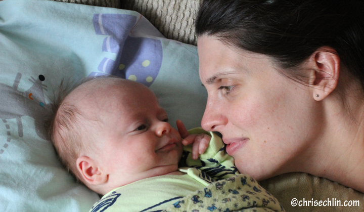 Today Mommy and I went to visit Rebecca and Ivy. We played on the exercise mat and I showed off to Ivy all the new things that I have learned. I can now kick my feet and move my arms and everything. I am starting to look around an notice stuff too. I really like the mirror on my exercise mat. I spend lots of time looking at it.